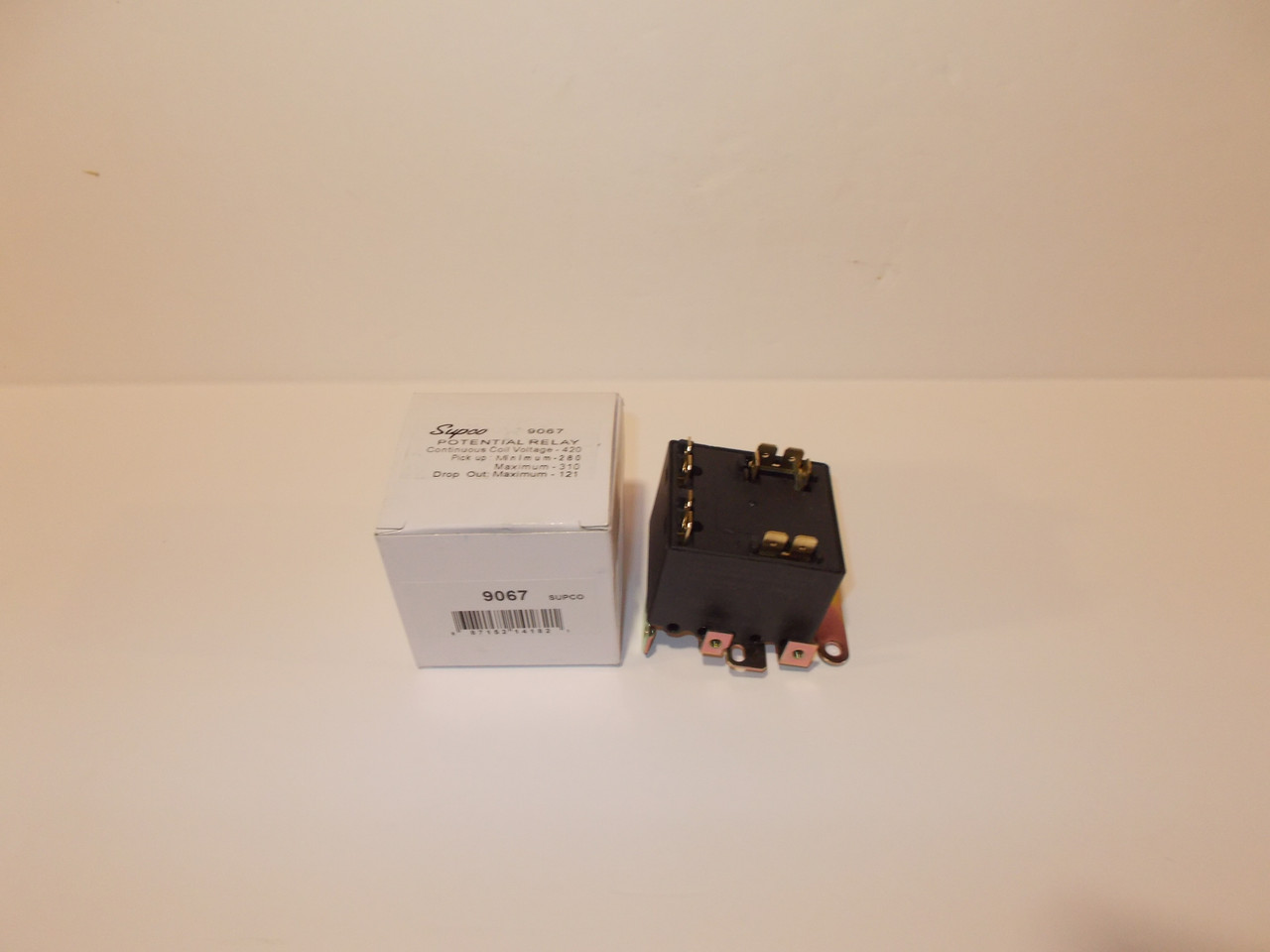Potential Relay for 1/2 to 5 HP, 230V. Continuous Coil Voltage 420 , Pick up Minimum 280, Pick up Max 310, Drop out Max 121. Six mounting positions. 50/60 HZ. Electrical diagram provided on the label. Silver Alloy. U.L. Registered. Made by Supco Corp. Part No. 9067